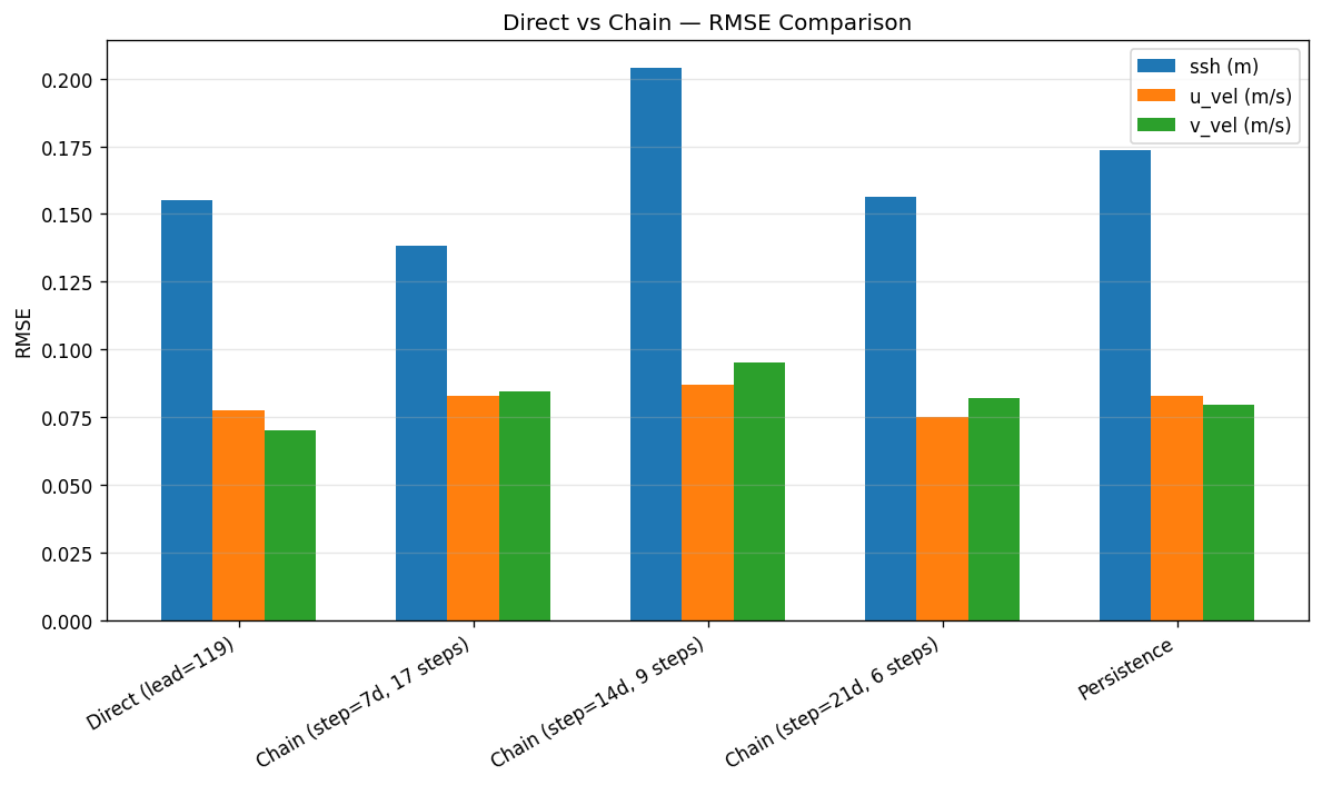 Same start and end point. Direct = one-shot prediction. Chain = autoregressive with intermediate steps.